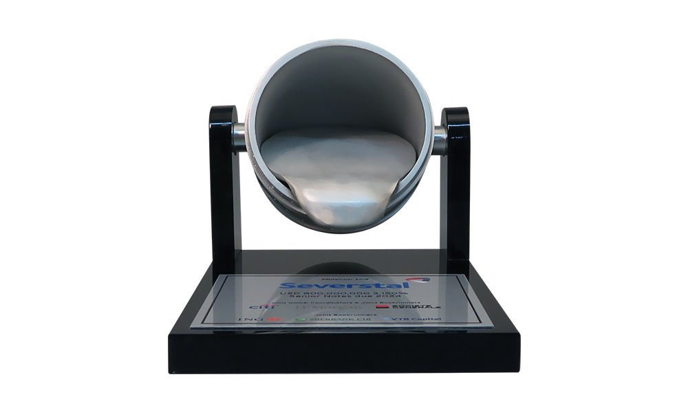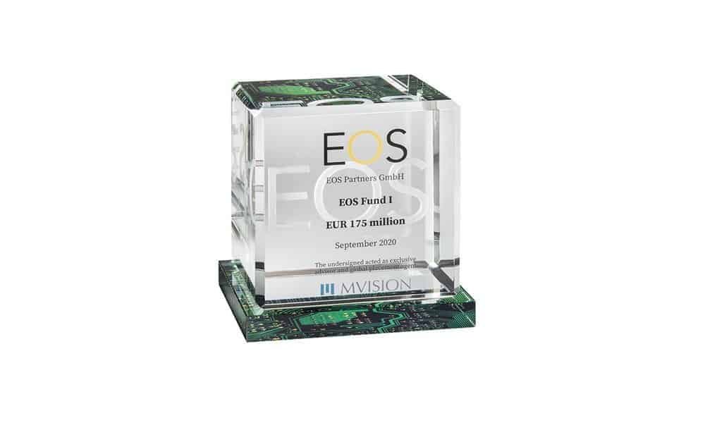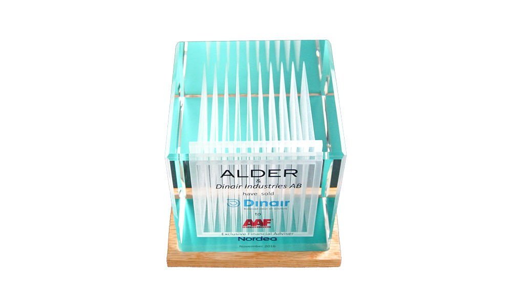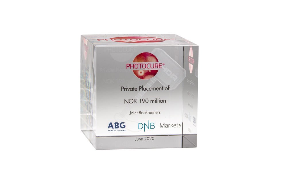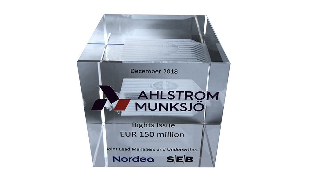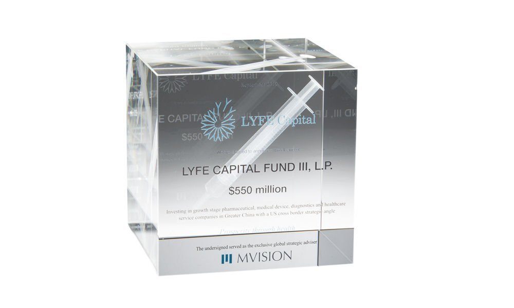 Not many other designs could convey this kind of information (that the piece celebrates an agreement making a lung disease treatment accessible to Japan) so seamlessly and elegantly. The piece below it, with the laser-etched syringe, is another example. It not only celebrates the successful launch of an investment fund but also makes clear its primary focus: healthcare.