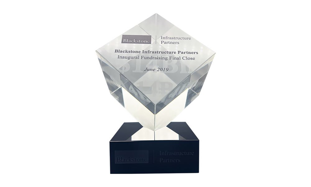A small repositioning of a crystal cube can transform its visibility and prominence—and therefore increase its perceived value among recipients and others. This can be achieved simply by laying the cube on its corner, as in the Blackstone piece above, and the two pieces shown below. Again, the alteration to the design is relatively minor, but the effect on its impact can be considerable.