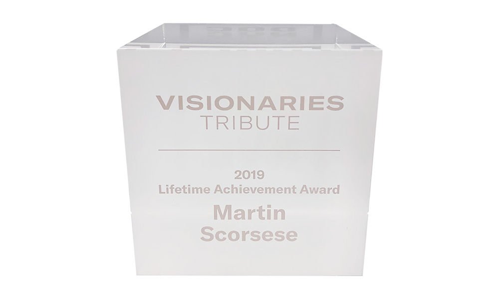 There are any number of additional techniques that enhance a cube design . The designs shown below highlight just a few. The Spirit piece below demonstrates how the mere addition of bevelled edges can heighten the effect of a design. The UL piece illustrates the effect of external laser etching, and the Martin Scorsese DOC NYC award the effect of “frosting”.