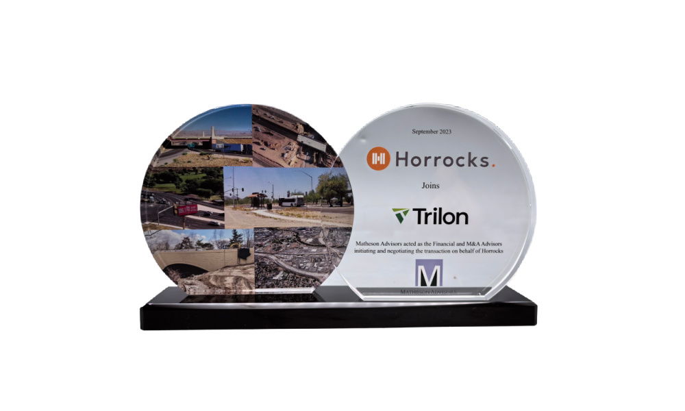 Custom crystal commemorative marking a strategic partnership between engineering firm Horrocks, and the Trilon Group, an infrastructure consulting business. (23AKL432)