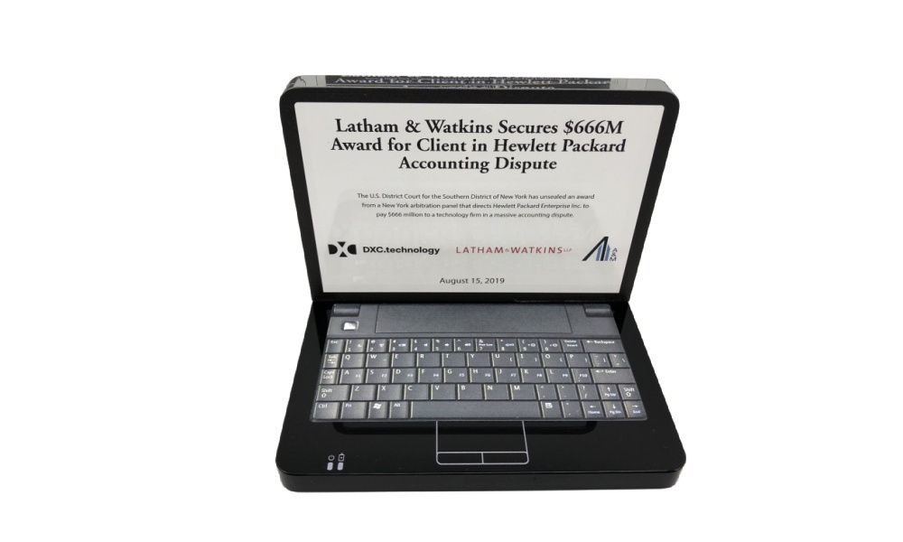 - A custom Lucite showcasing press accounts of a firm’s victory in a high-profile case.