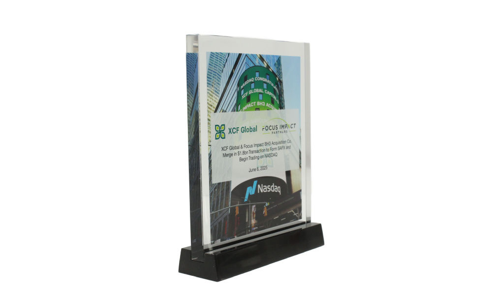 - A custom Lucite tombstone marking the rebranding of an investment management firm.