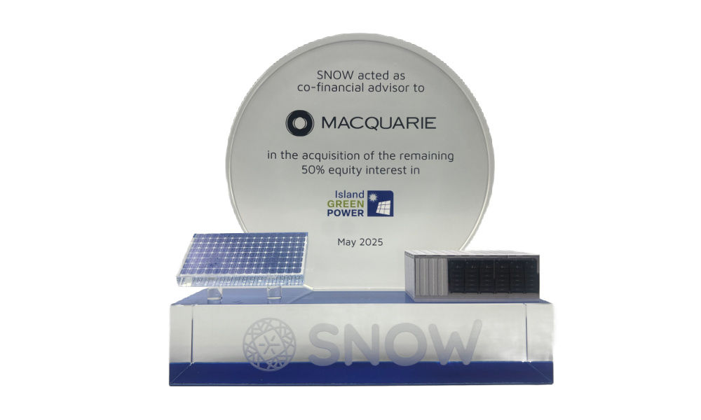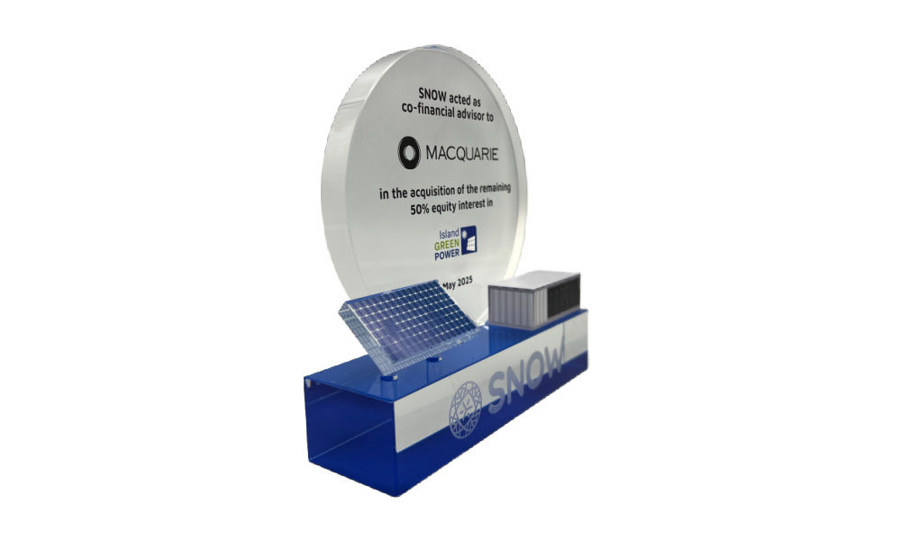(9AMF234)Custom crystal deal toy marking the acquisition by Macquarie Asset Management of an additional 50% stake in Island Green Power. The UK-based power producer develops solar and Battery Energy Storage Systems (BESS) projects. (25LNL054)
