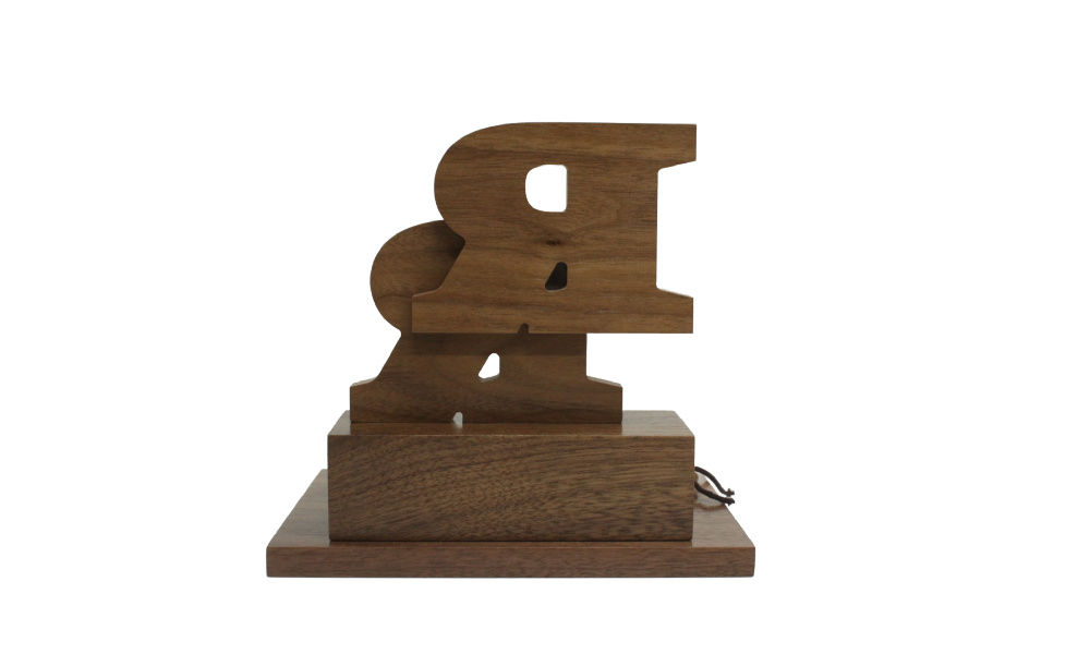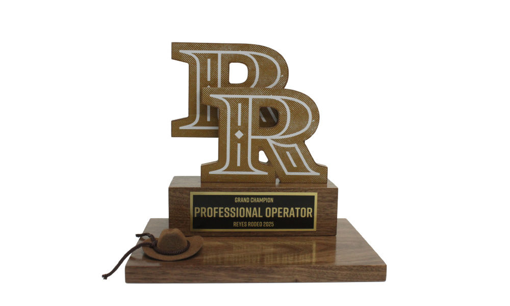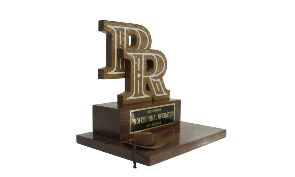 (9AMF104)Custom wood trophy, incorporating a cowboy hat, awarded at a company-wide employee event at food and beverag company Reyes. (25AZH144)