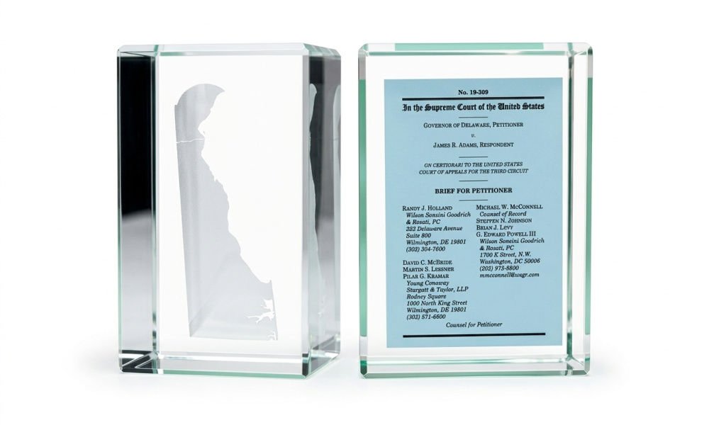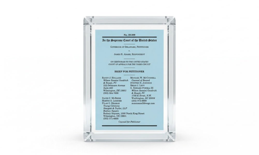 Lucite cube, with an embedded cover sheet, commemorating an amicus filing with the U.S. Supreme Court. (9AJH178)