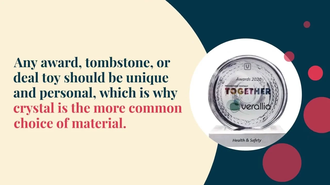Crystal, on the other hand, can be carved and shaped into more complex designs and also lends itself to laser-etched three-dimensional designs. Any award, tombstone, or deal toy should be unique and personal, which is why crystal is the more common choice of material.