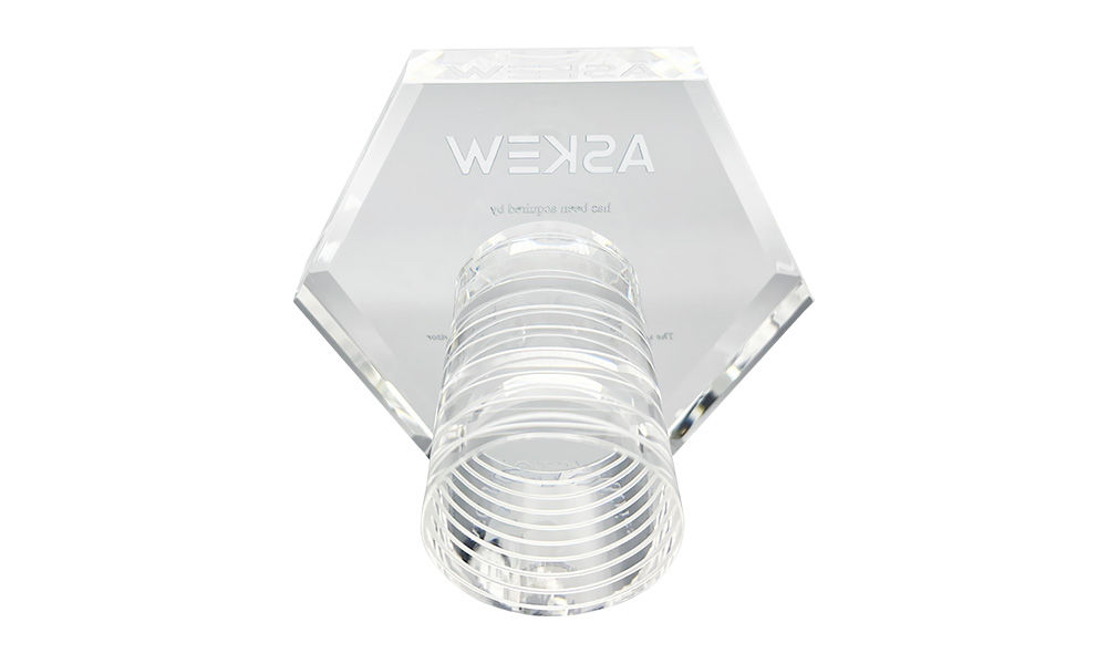 (22LJW019)Crystal deal toy commemorating the acquisition of Askew Industrial. The Santa Fe Springs, California-based company manufactures industrial products, including bolts. (22ALJ064)
