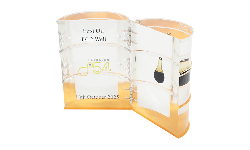 (9AKL633)Lucite commemorative, with hinge opening to display an embedded oil vial, celebrating “first oilat the D1-2 well at Dawes Island in Nigeria. (25LNL138)