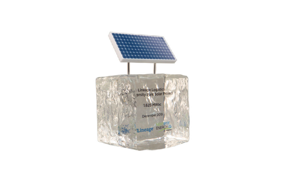 Custom Lucite tombstone marking the launch of a solar farm in University Park, Illinois. (9AKL684)