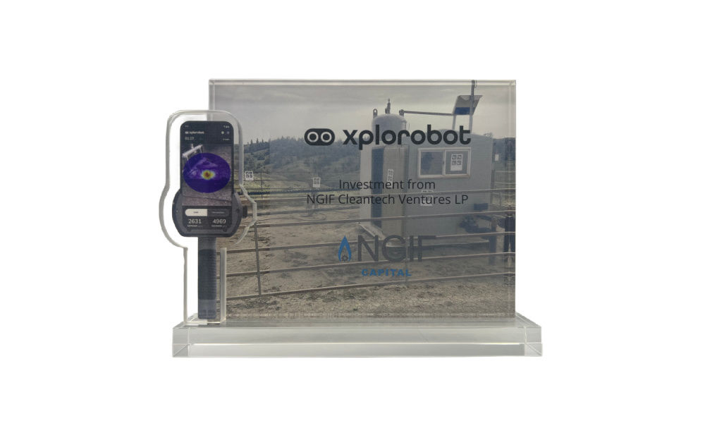 Custom crystal deal tombstone commemorating the investment by NGIF Capital in Xplorobot. The Houston-based cleantech company has developed technology for the detection and repair of methane leaks. (25AZH160)