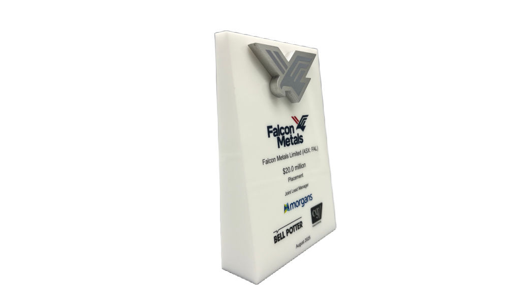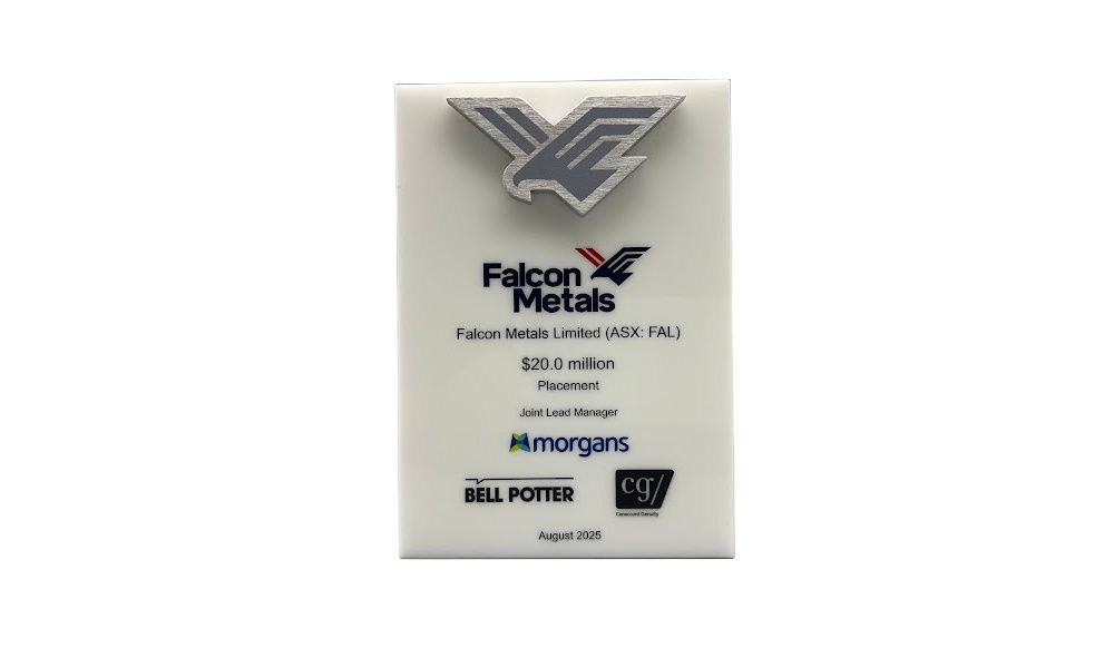 Wedged-shaped deal toy, incorporaing a cutout metal logo, commemorating a share placement by Falcon Metals. The minerals exploration company is headquartered in Melbourne, Australia. (25ALJ209)