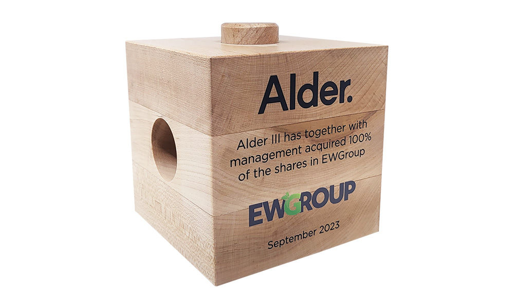 Modular wood deal tombstone commemorating the acquisition of EWGroup, a Swedish environmental firm specializing in the remediation of contaminated materials. (23LJW111)