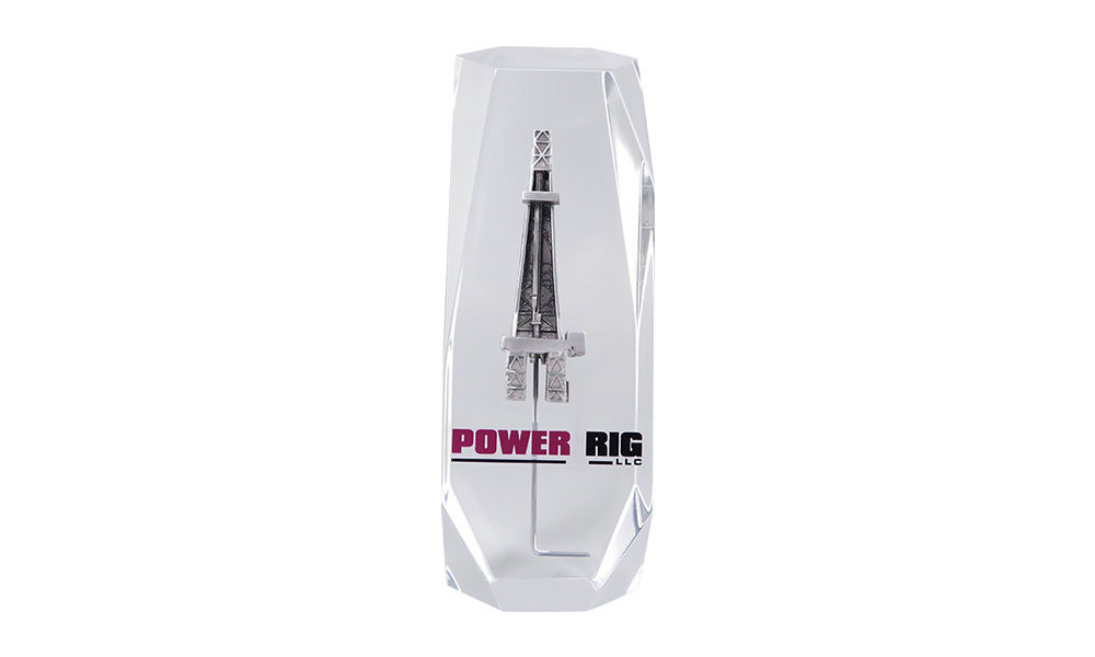 Custom Lucite commemorative with embedded pewter oil & gas drilling rig. (21AKL473)
