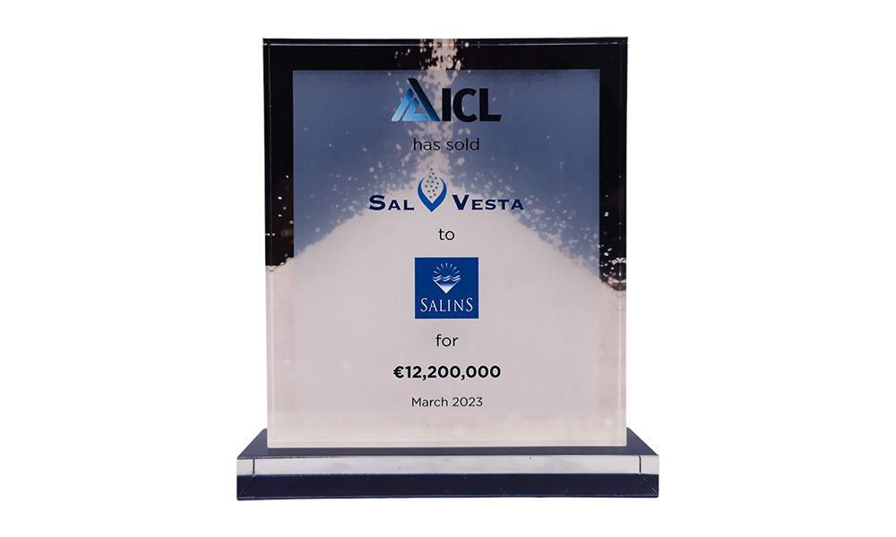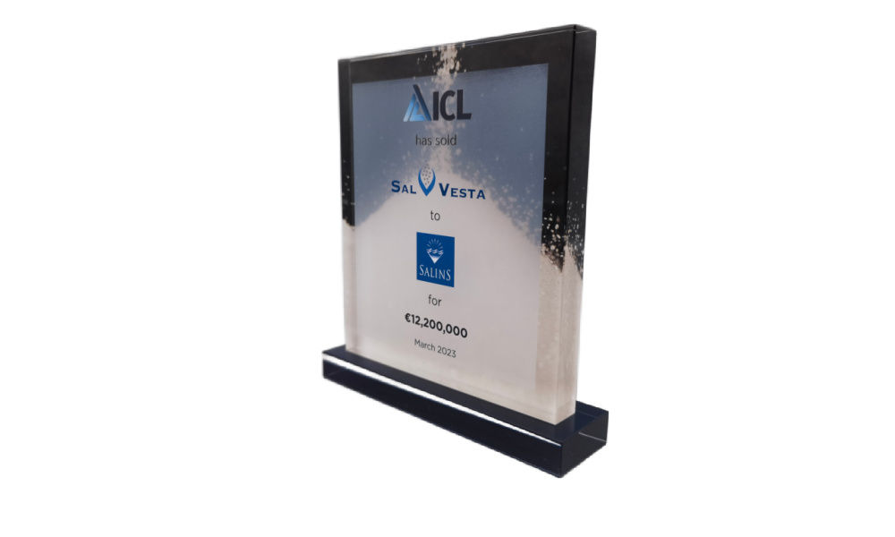 Crystal deal tombstone, incorporating frosted text, recognizing the sale of Sal Vesta. The Spanish company produces, packages, and sells high-purity salt. (23LNL053)