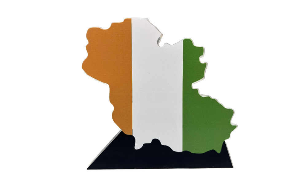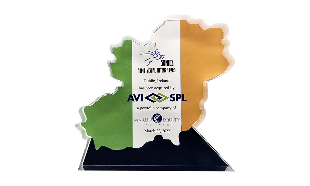 Crystal deal tombstone, cut in the shape of Ireland, marking the acquisition of Dublin-based audio-visual firm Sonics. (22AKL177)