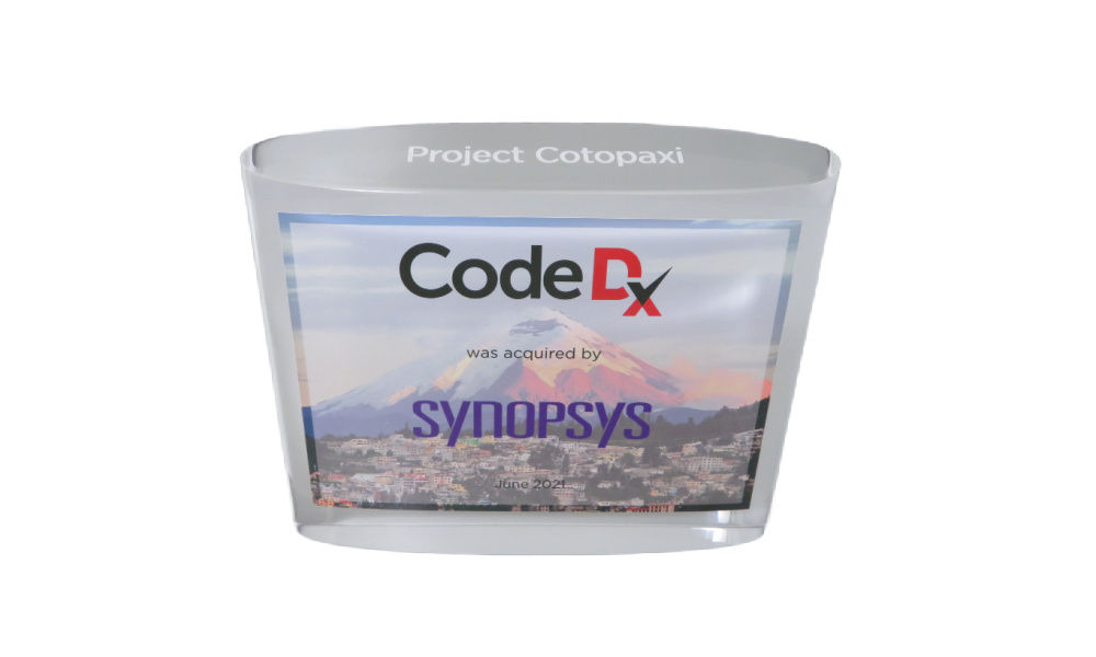 Oval Lucite deal tombstone, featuring a slanted top with lasered text, marking the acquisition of Code Dx. New York-based Code Dx is a developer of an application security software tool. (21AKL377)