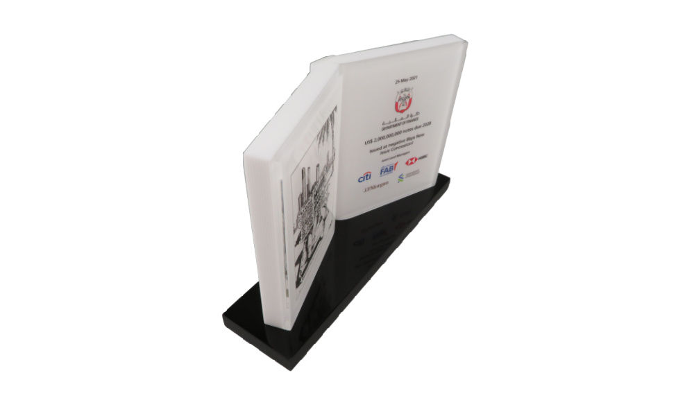 Crystal “open book” deal toy recognizing a successful sovereign bond issue by the Emirate of Abu Dhabi. (21LSS266)