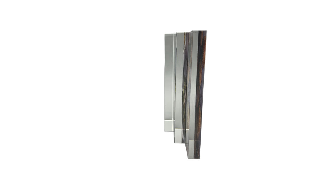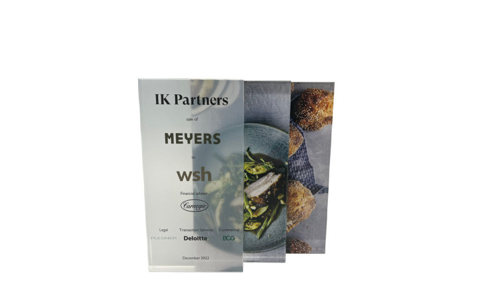 Crystal deal toy, featuring three separate rectangular panels, commemorating the acquisition of Danish hospitality company Meyers. Headquartered in Copenhagen, the company operates restaurants and bakeries. (23LJW009)