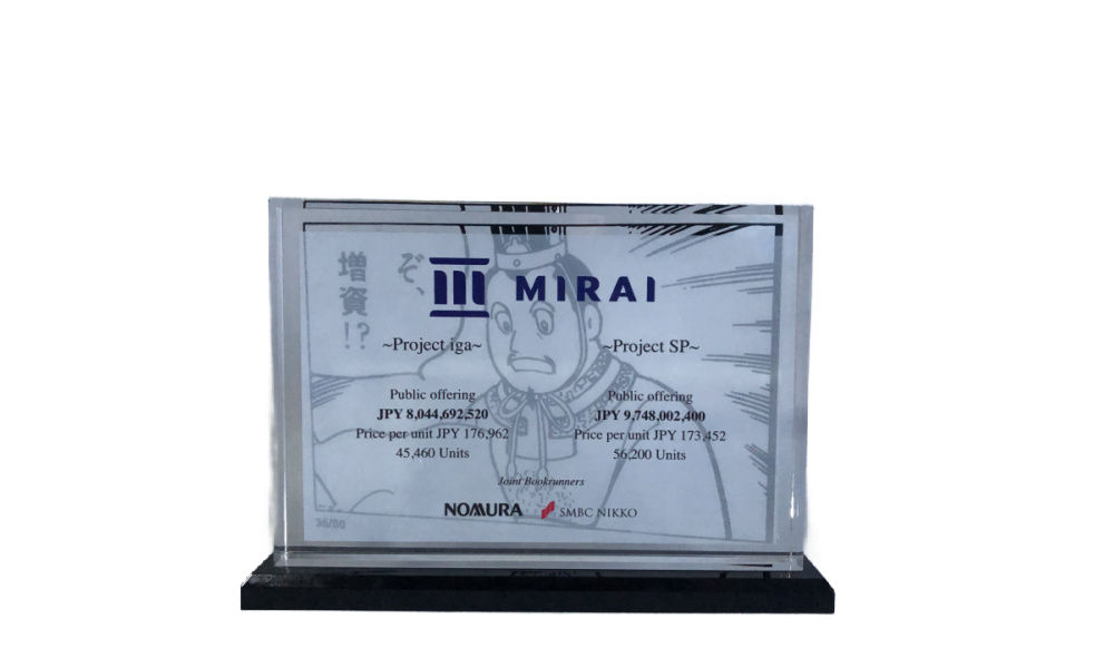 Crystal financial tombstone marking pubic offering by Mirai Corporation, a Japanese REIT. (8AKL398)