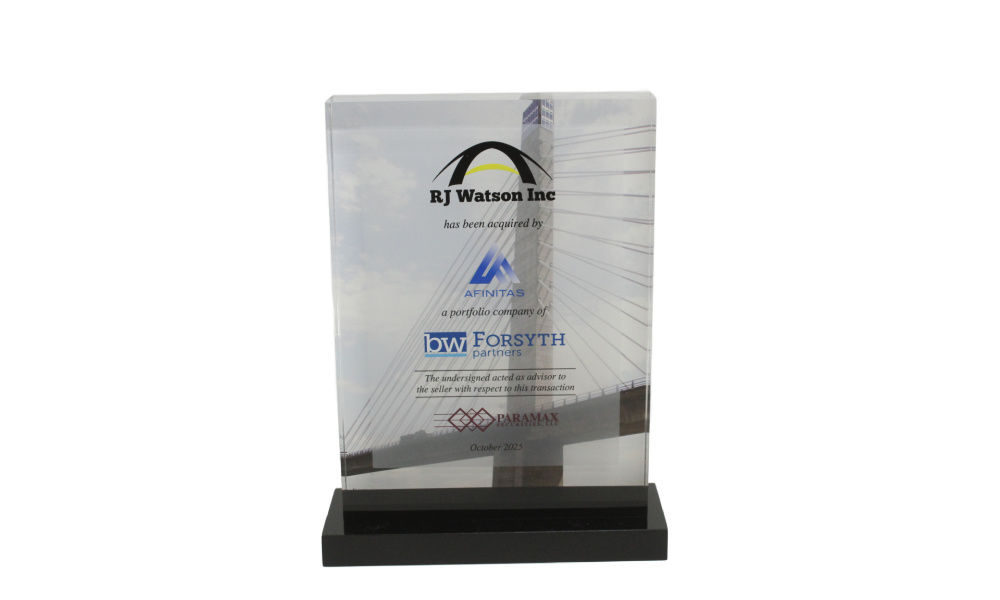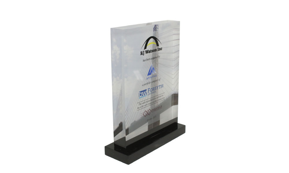 Lucite tombstone marking the acquisition of RJ Watson, a structural engineering firm focused on the bridge, highway, and heavy construction sectors. (25AZH213)