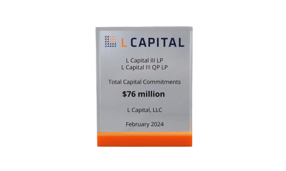 Lucite tombstone, featuring a plexi bottom matched to a logo color, commemorating the close of Fund III by L Capital. The fund focuses on middle-market tech companies. (24ALJ129)