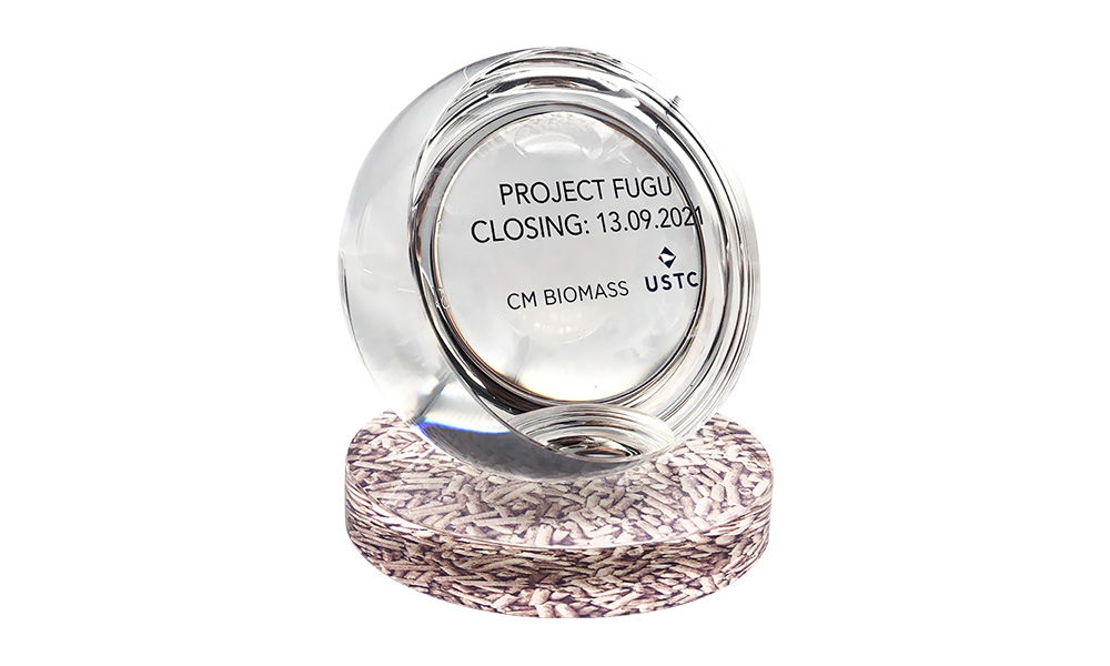Lucite tombstone, featuring a half-sphere on a circular base, recognizing the acquisition of a majority stake in CM Biomass. The Copenhagen-based wood pellet trading company serves as an alternative energy provider to European utilities. (21LJW228)