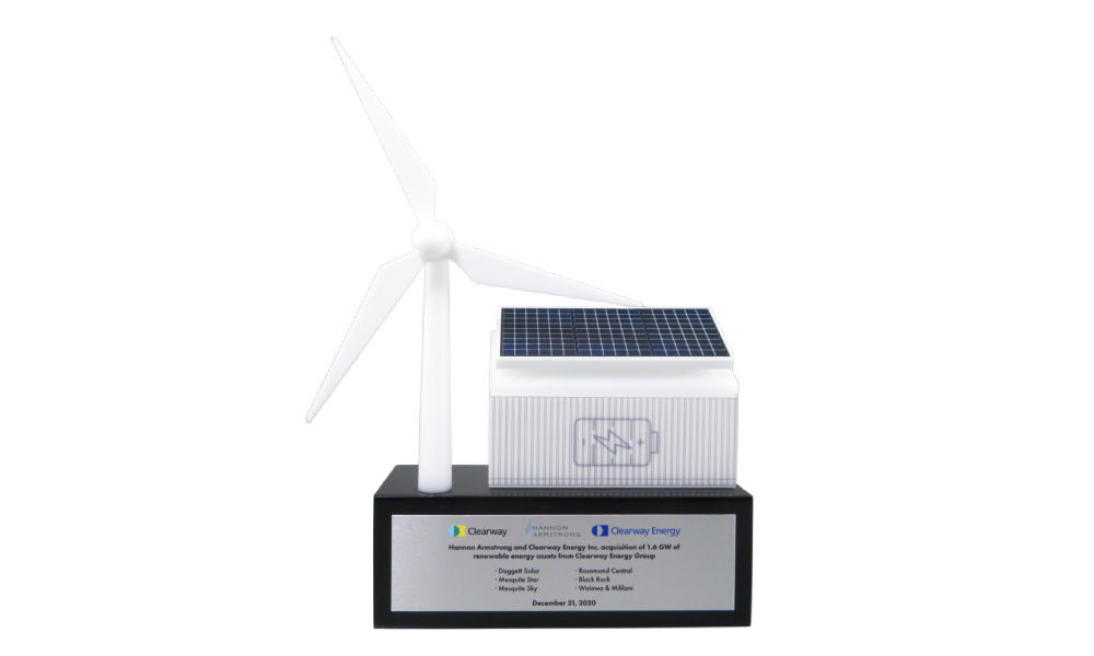 Lucite deal toy, with both a wind turbine and a solar panel, marking a transaction involving solar and wind power projects in California, Hawaii, Texas, and West Virginia. (21AKL137)