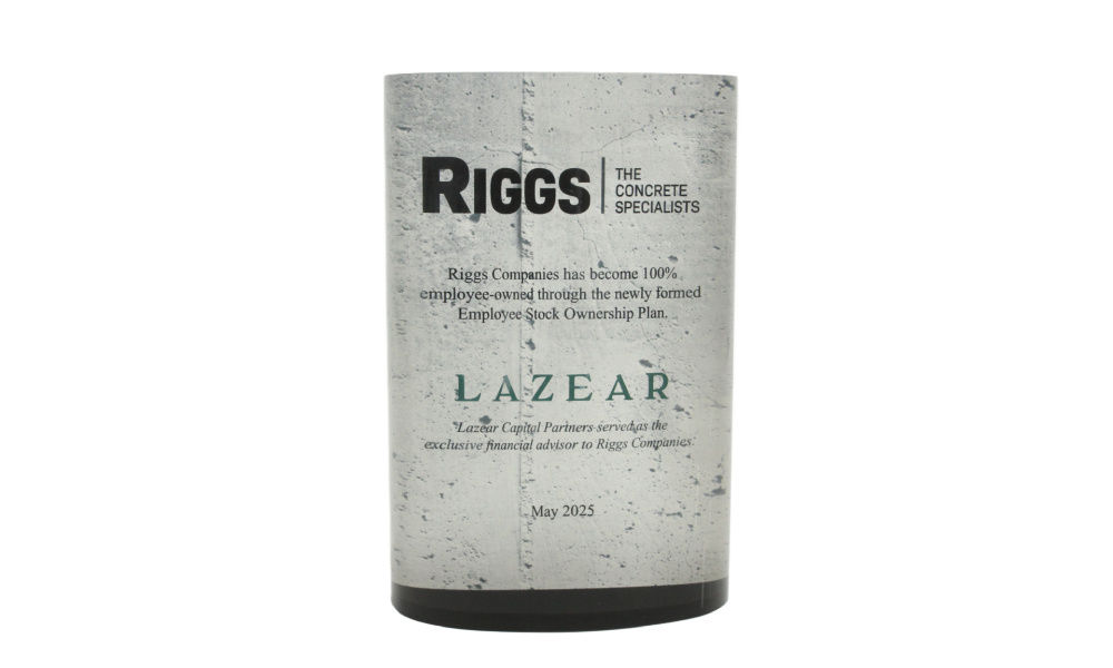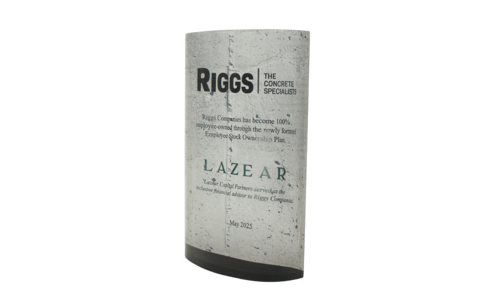 Half oval-shaped Lucite celebrating the transition of Riggs Companies to 100% employee ownership through an Employee Stock Ownership Plan (ESOP). Based in Phoenix, Arizona, Riggs is a concrete contractor. (25AKL219)