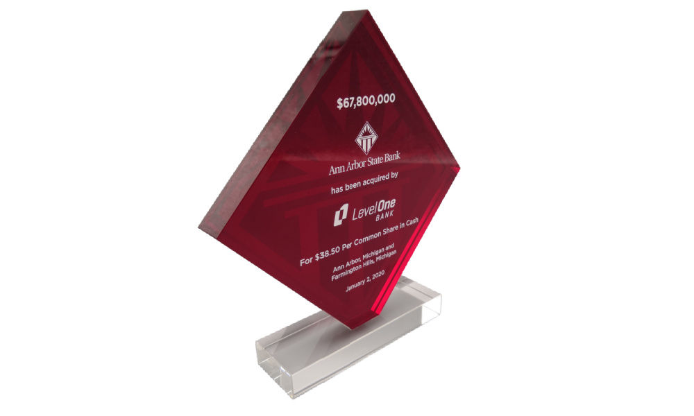 Logo-themed crystal deal toy recognizing the acquisition of Ann Arbor State Bank in Michigan. (20AKL276)