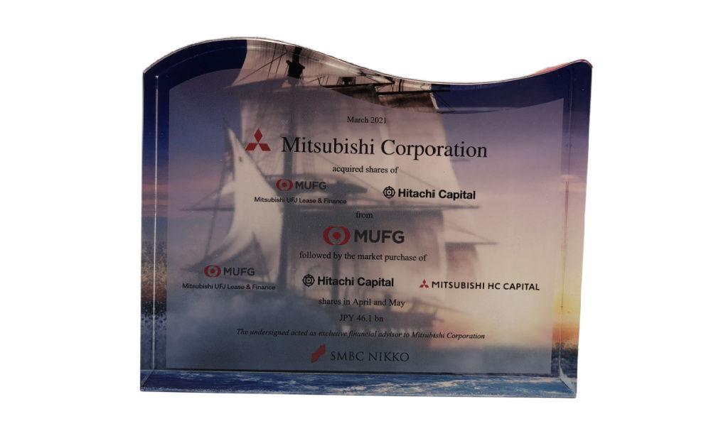 Crystal deal tombstone, featuring a wavy top, recognizing a share purchase agreement involving Mitsubishi Corporation, Mitsubishi UFJ Financial Group, and MUFG Bank. (21AKL185)