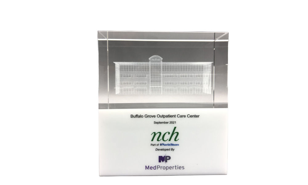 Custom crystal, incorporating a 3-D etching of the building, celebrating the grand opening of the Buffalo Grove Outpatient Care Center. The 80,000 square-foot facility is located in Buffalo Grove, Illinois. (21AZH001)